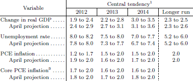 The chart shows the Fed has lowered growth projections. It is often said that a presidential election hinges on the unemployment rate. In April, the Fed projected unemployment rate of 7.8 to 8.0 for 2012. … Please click here or the title below to read more.