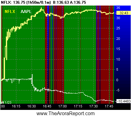 Both Apple (AAPL) and Netflix (NFLX) reported earnings after the close. It is said that a picture is worth 1,000 words. The chart tells the story better than any words can describe. There is a mind boggling 43% differential in the performance of the two stocks after hours. Just imagine if you were short Apple and long Netflix going into earnings, you would have realized a 43% gain in 90 minutes. Of course I was not clairvoyant enough to capture the trade.