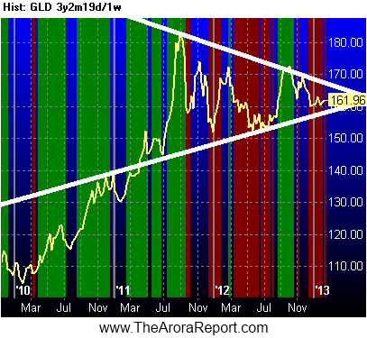 As the chart shows, gold has traced a symmetrical triangle pattern. Many adherents of traditional technical analysis believe that generally a symmetrical triangle is a continuation pattern. Since the long-term trend of gold is up, the symmetrical triangle implies a breakout on the upside and is thus a bullish pattern.